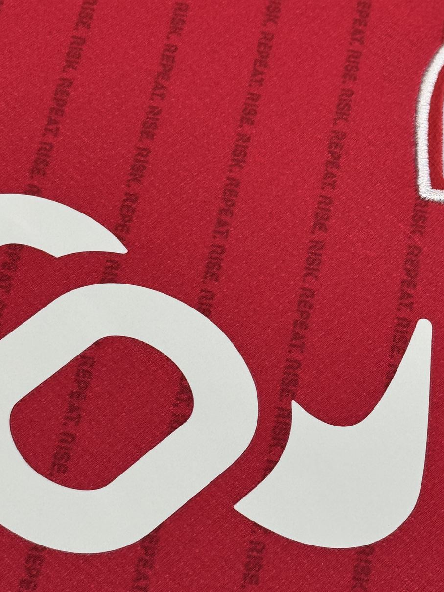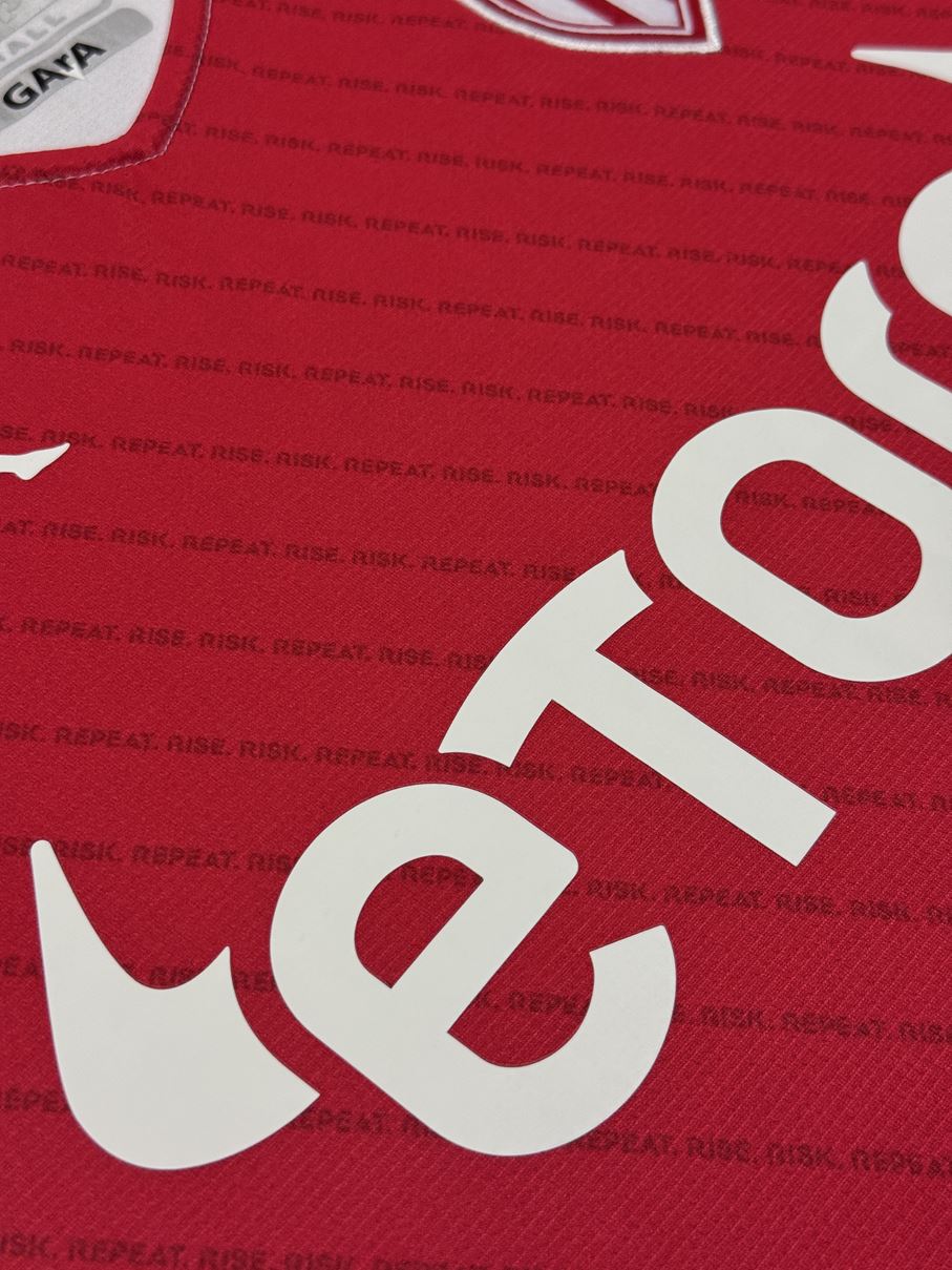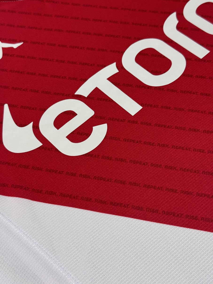 クラブのスローガンである「RISE. RISK. REPEAT」の文字で構成されたピンストライプが赤い部分に走っているホームモデル。