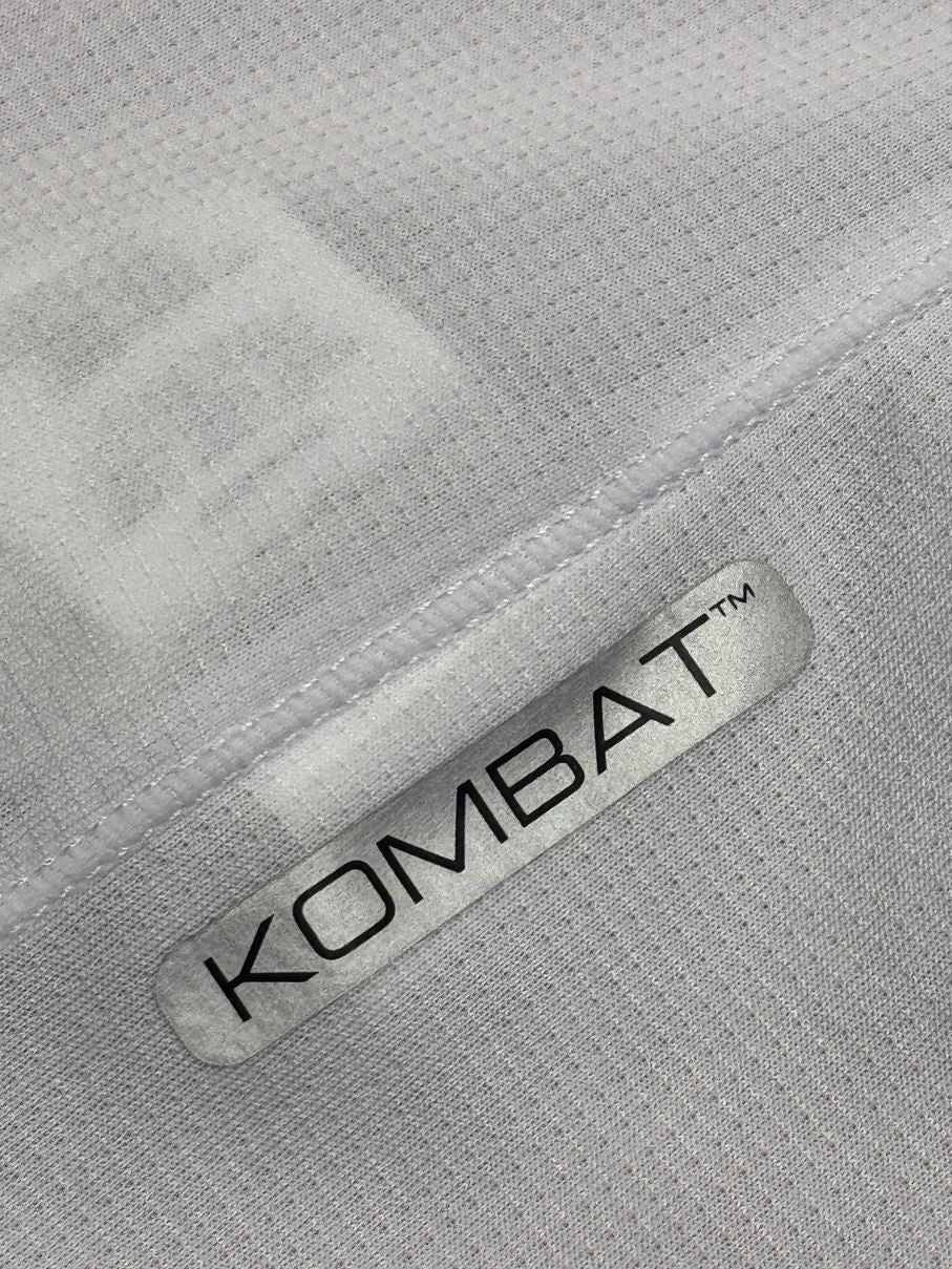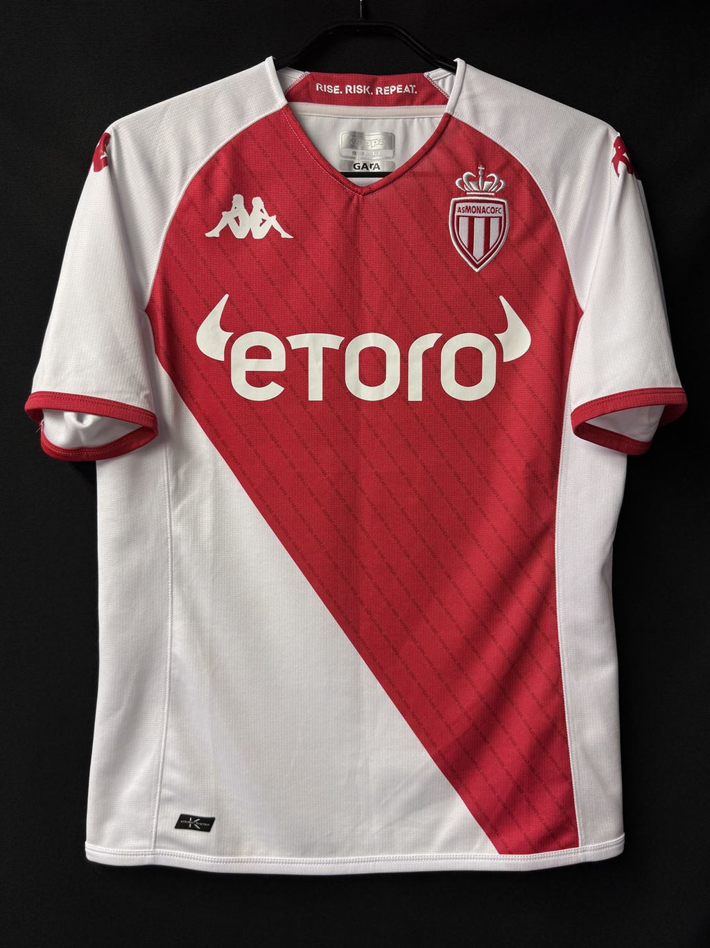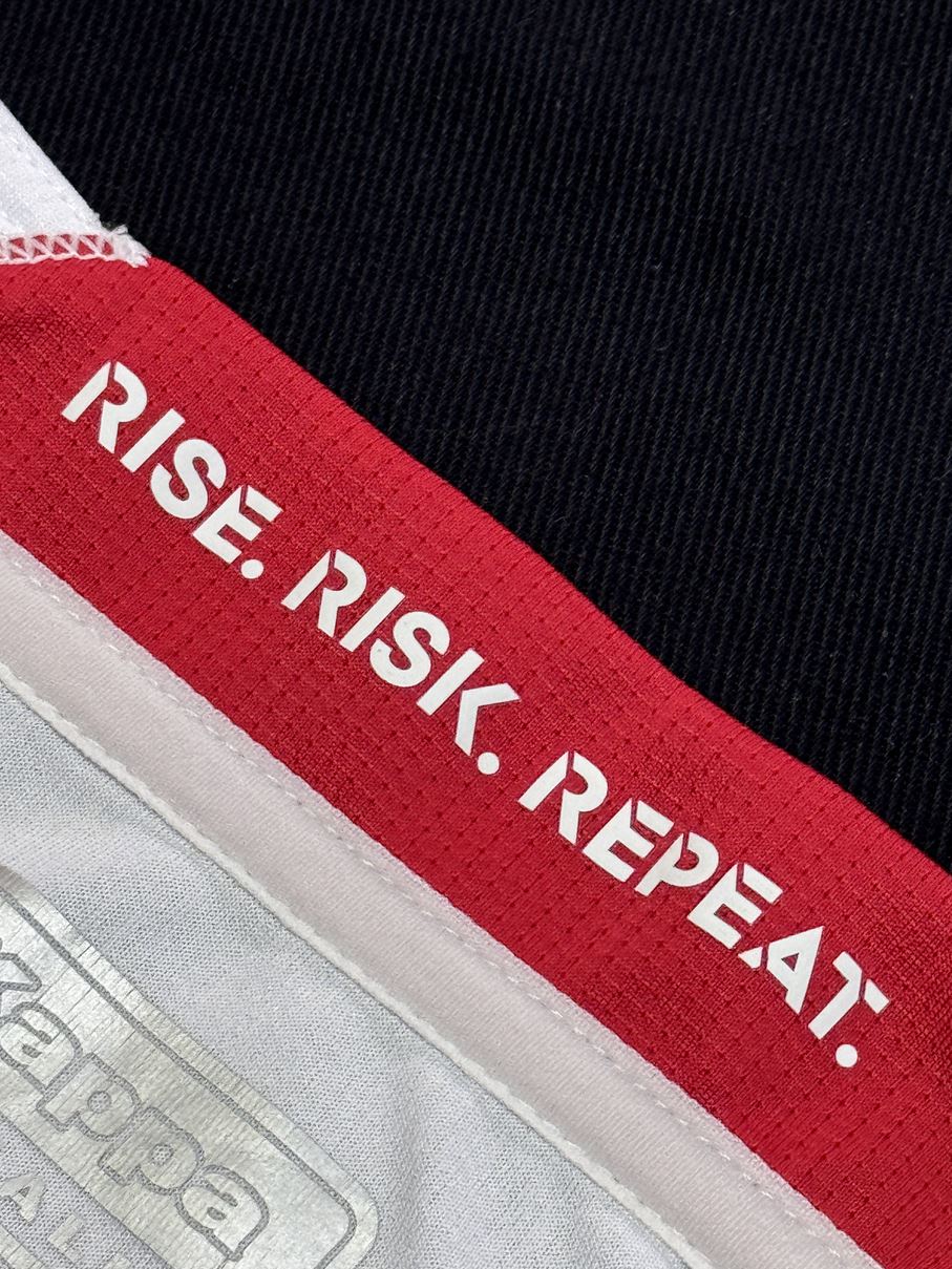 クラブのスローガンである「RISE. RISK. REPEAT」の文字で構成されたピンストライプが赤い部分に走っているホームモデル。