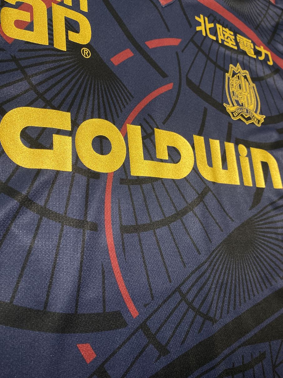 背面のXラインはカターレ富山のユニフォームの象徴としてシーズンユニフォームと共通で起用されサマーユニフォームのオリジナリティとして、「ONETOYAMA」ロゴから上のXラインに重ねる形に"リフレクタープリント"を施し、ラインの一部分が照明に反射して光るというギミックを追加されました。