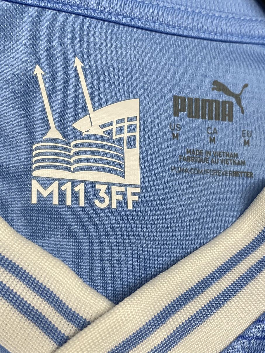 「エティハド スタジアム」の象徴的な特徴に敬意を表し、移転後の初シーズンに着用されたユニフォームからインスパイアされスタジアムの外から見える4つの巨大な塔をモチーフに同系色のストライプを施しています。
