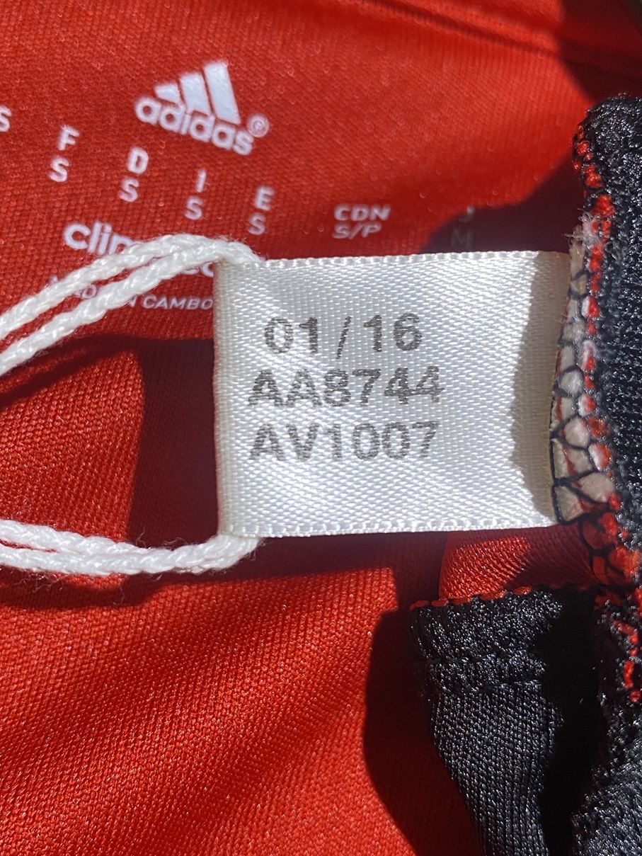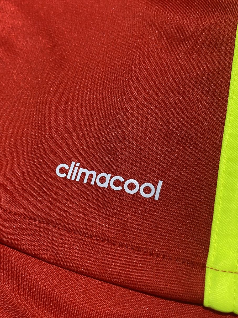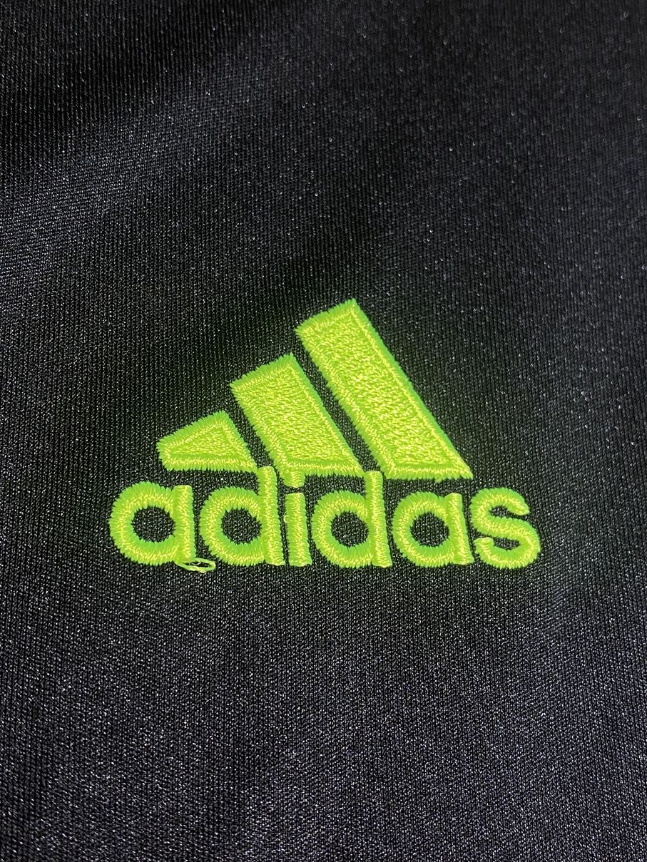 上下で分かれたツートンカラーにブラックとレッド、adidasロゴや三本ラインにイエローが配されています。