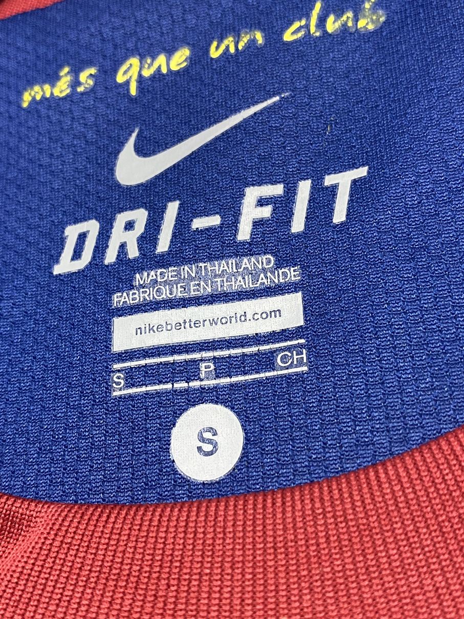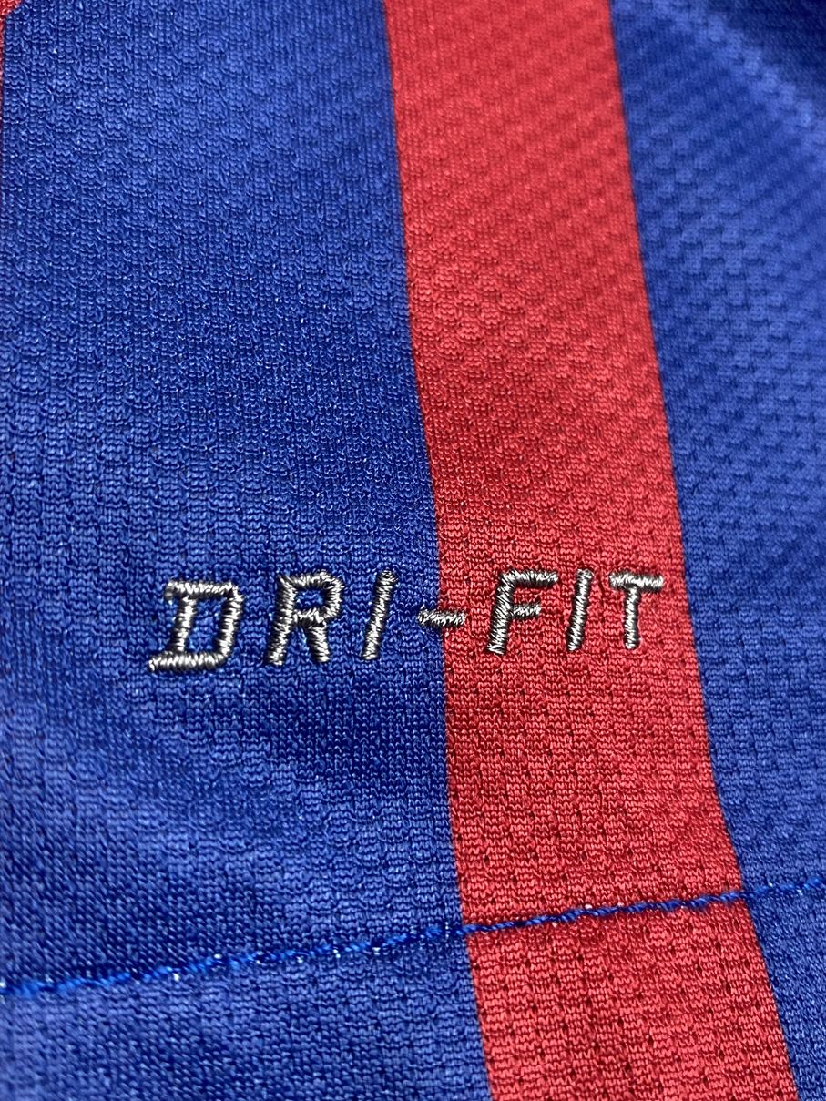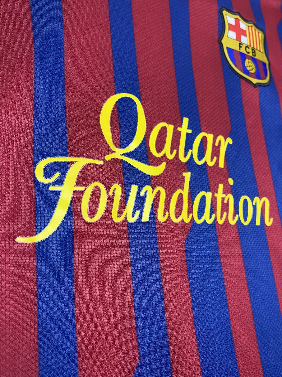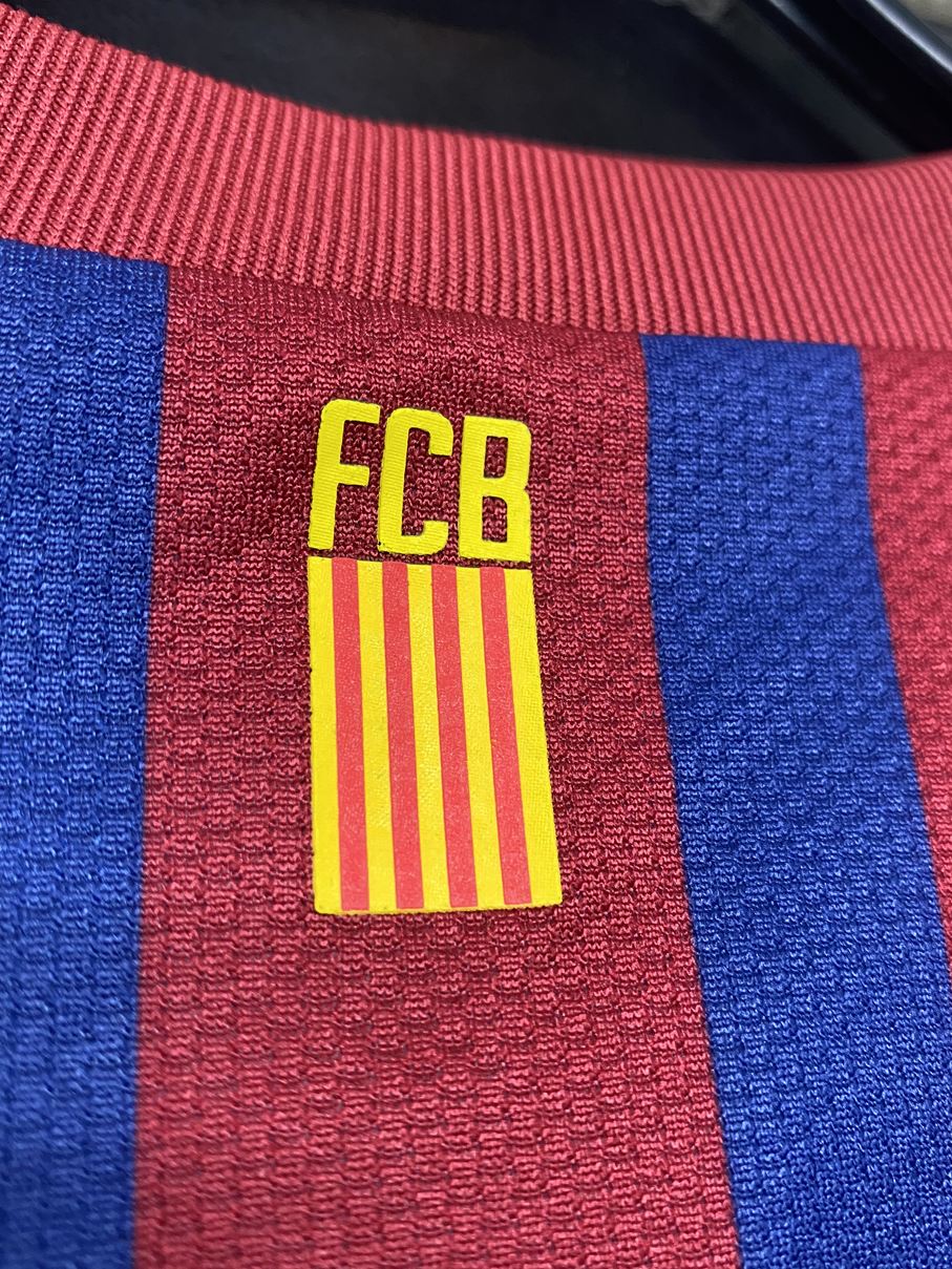 伝統的な「アスルグラナ(青とエンジ)」を忠実に守りつつ、現代的でシャープな印象を与える細めのストライプを採用したホームモデル。胸スポンサーロゴが「カタール財団」に変更になり、「ユニセフ」ロゴは背中側に圧着されています。