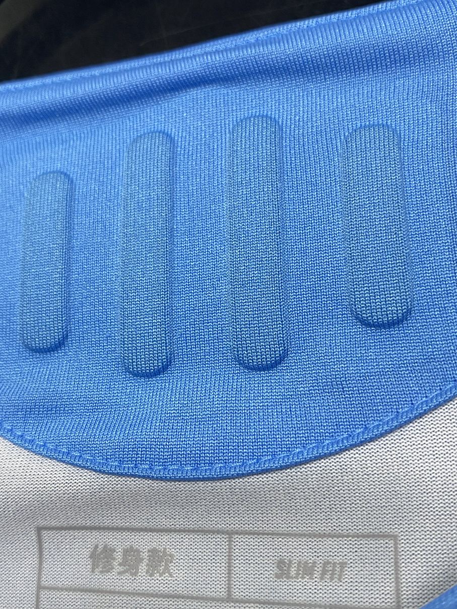 伝統の水色と白のストライプ柄で襟は中に白ラインが入ったクルーネックとなりました。