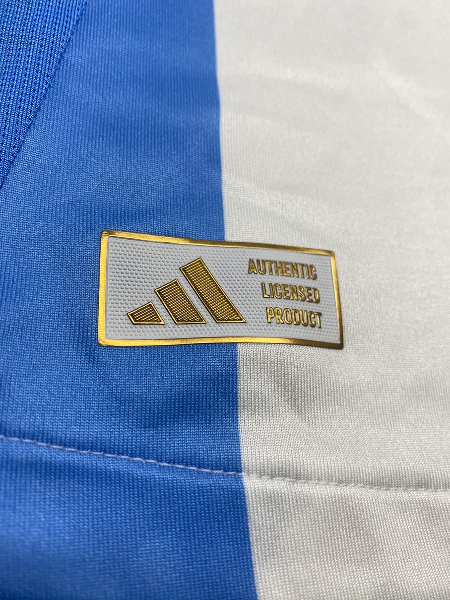 胸には金で協会、アディダスロゴと2022ワールドカップ優勝パッチが配されています。