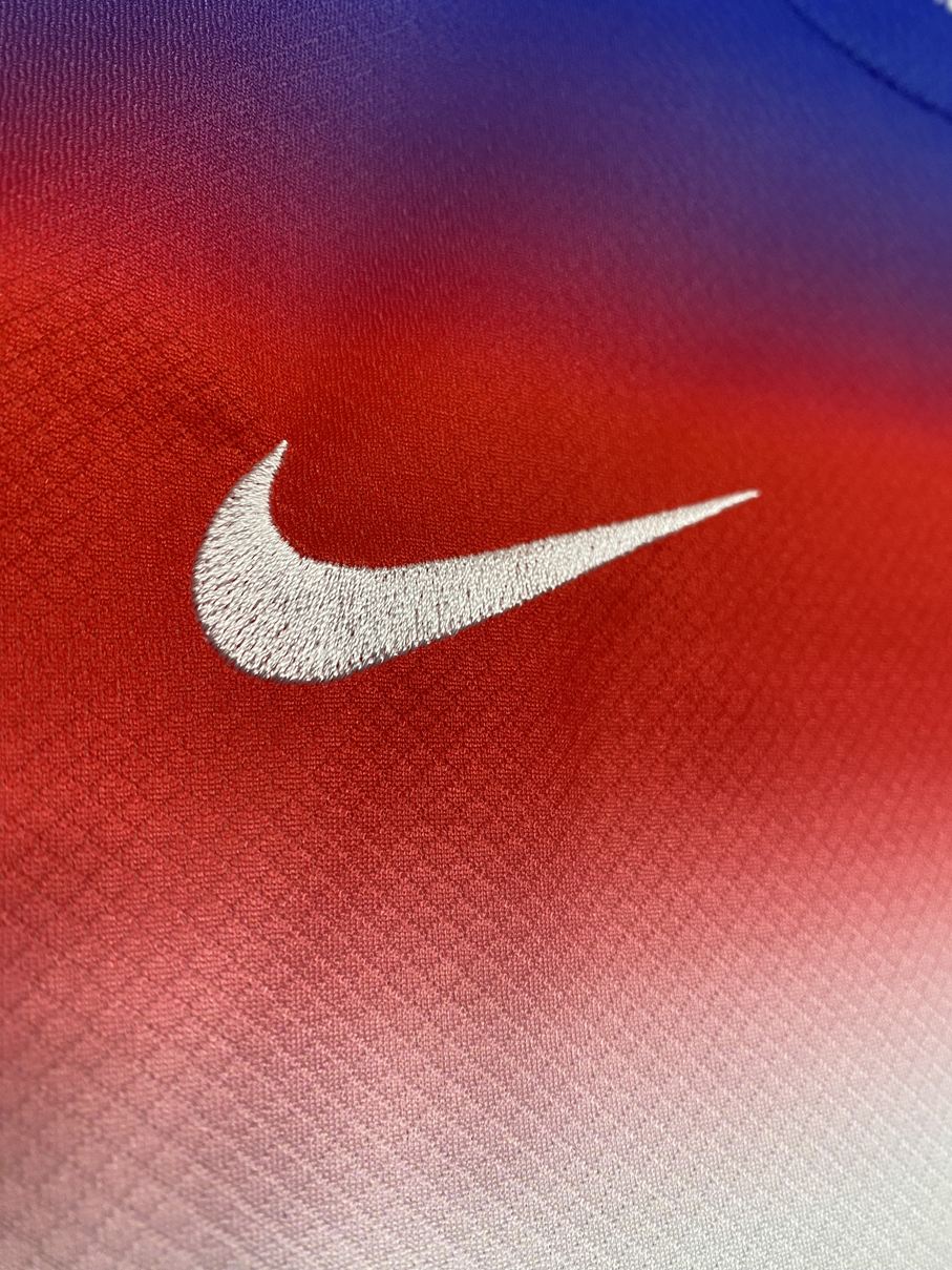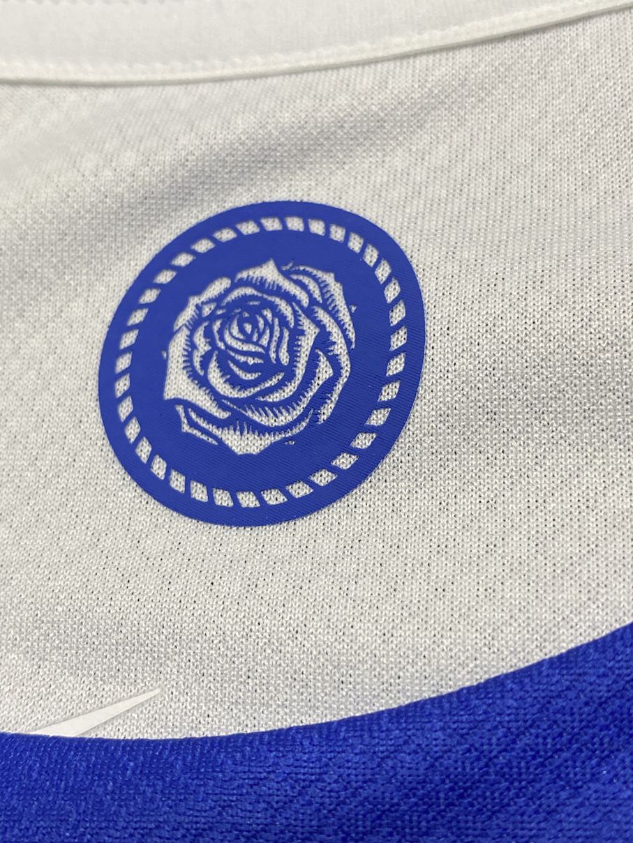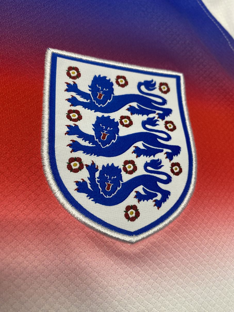 1982年のスペインW杯でイングランド代表が着用したモデルに触発され、白基調で胸に赤と紺の横縞を配したデザインとなりました。