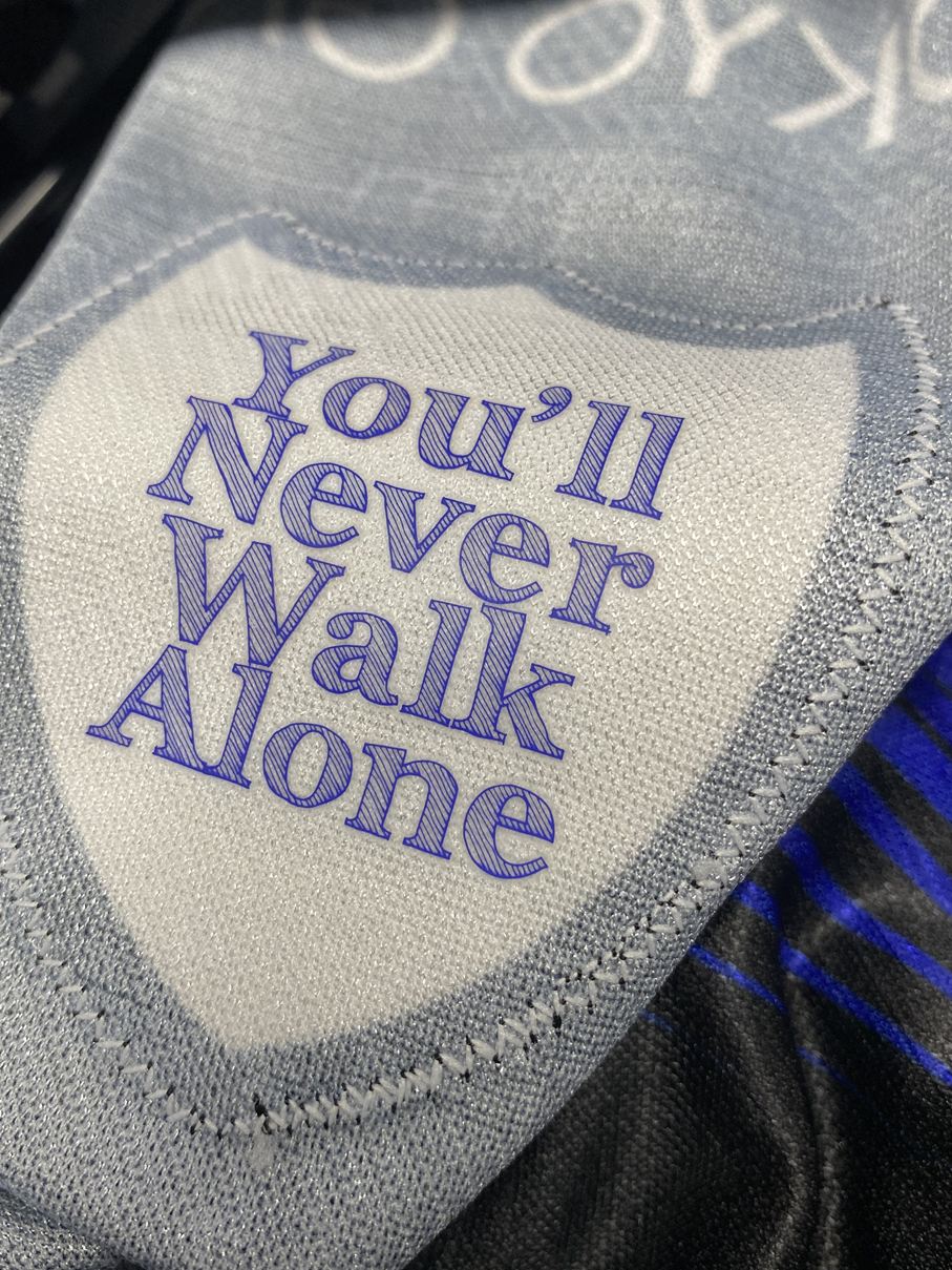 夏の夜をイメージしたブラックのカラーリングに、ライトアップされた東京タワーや東京スカイツリーを彷彿とさせる大胆なグラフィックを中央に配し、クラブカラーの青と赤が、クラシックなデザインにモダンなひねりを加えています。オーセンティックのみエンブレム裏には「You’ll Never Walk Alone」のメッセージがプリントされています。