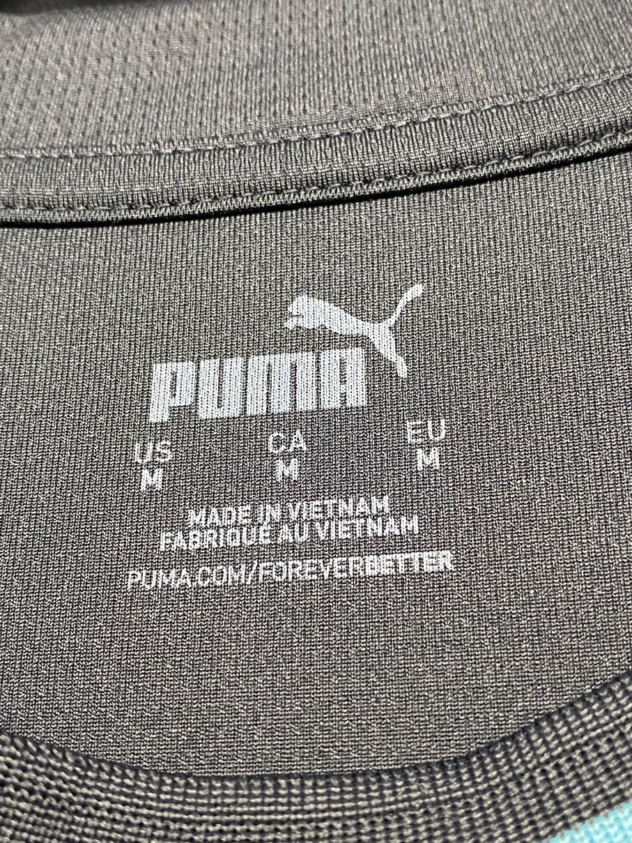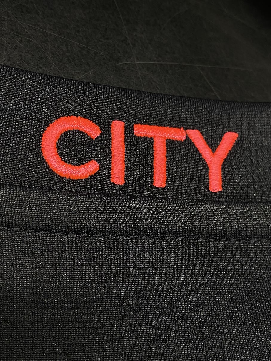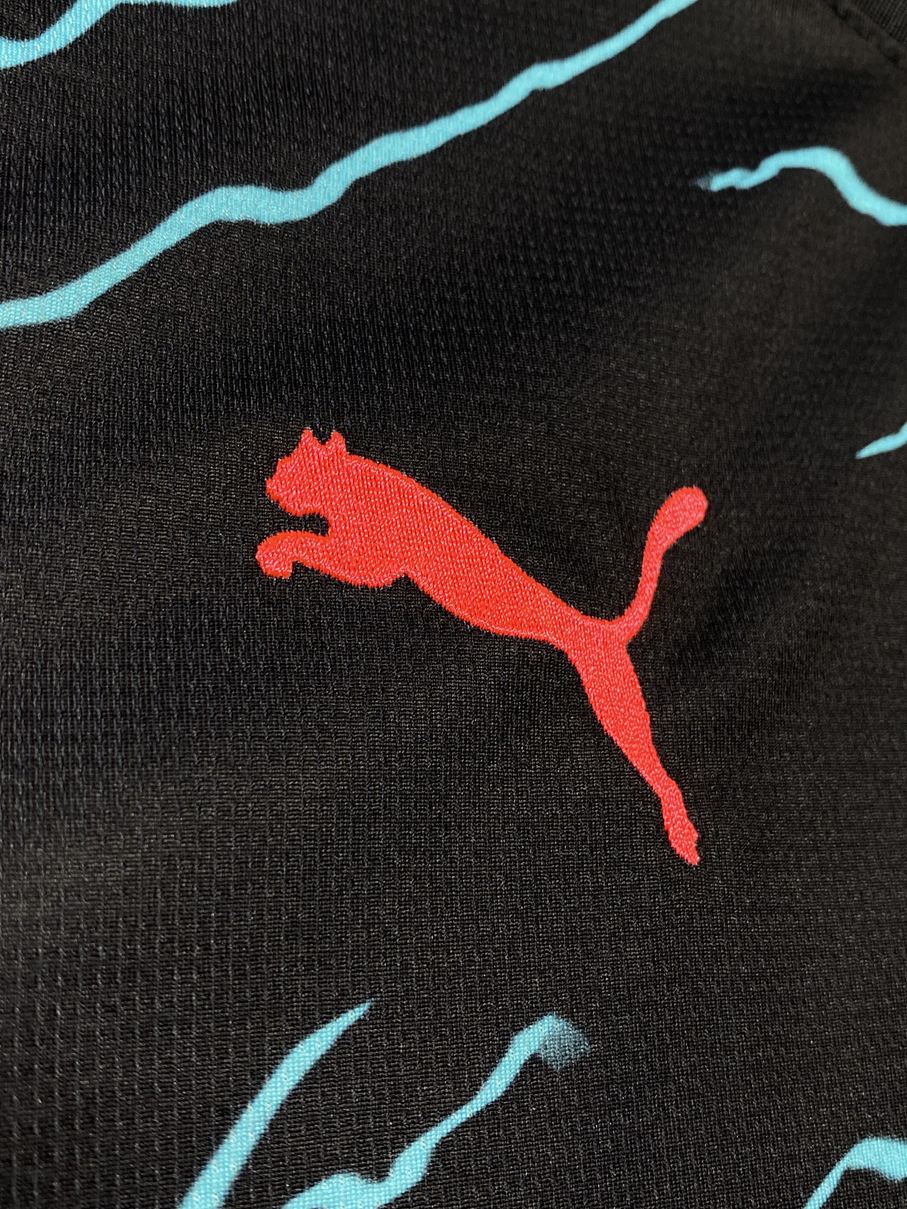 デザインには、全面に電流や火花をイメージしたパターンが施され、「Manchester City」 のクレストロゴとプーマの“キャットロゴ”がネオンピンクであしらわれています。