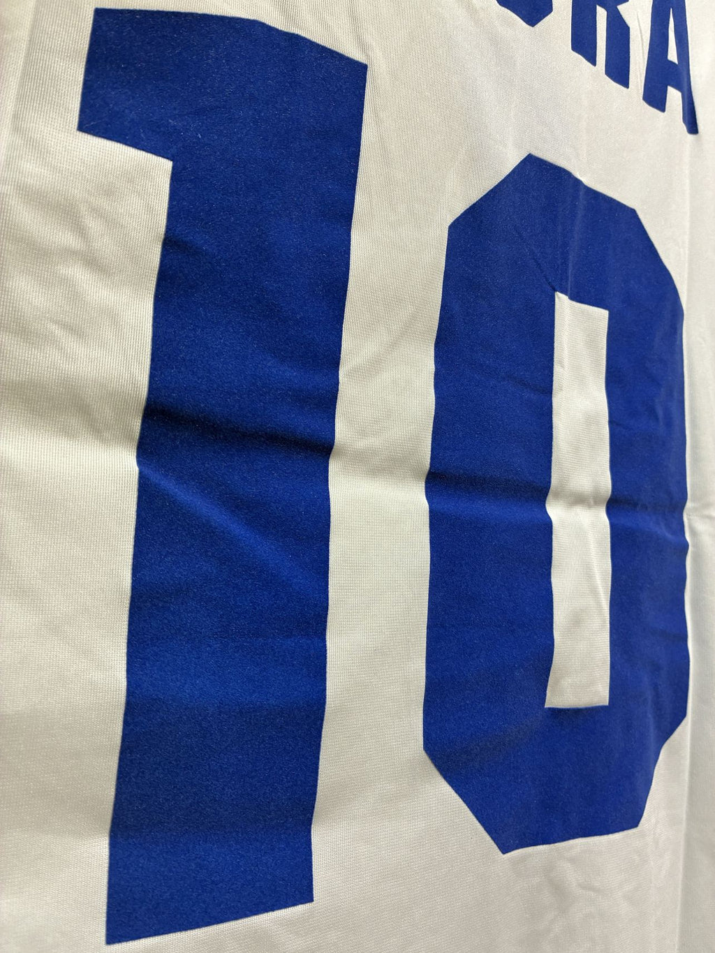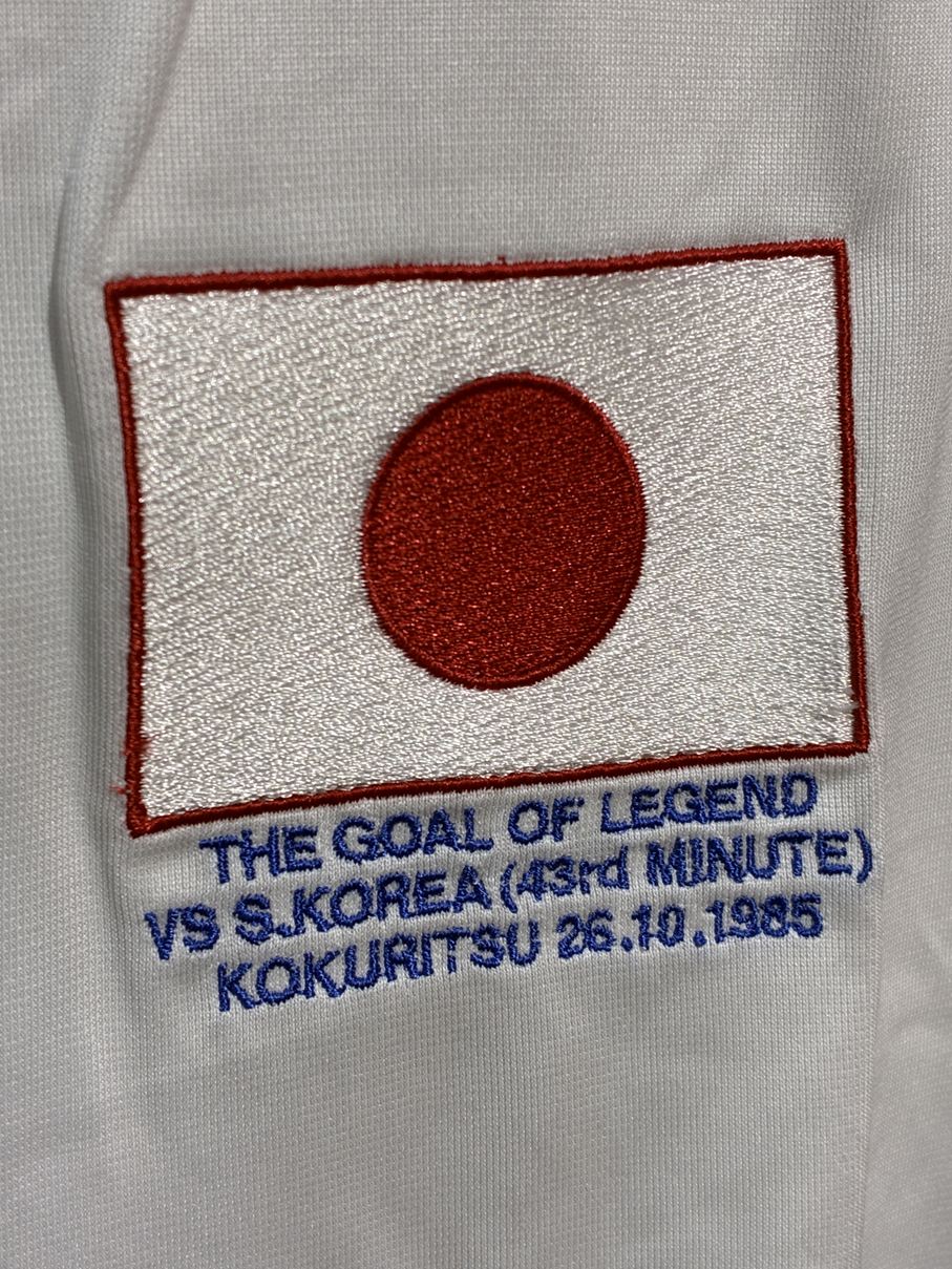 当時のサプライヤーはPUMAだった為、厳密に再現したものではありませんが、胸の国旗の下にゴールの瞬間の時刻まで記された記念刺繍、背中には木村和司氏のマーキングが入り、「伝説のFK」への敬意が溢れています。